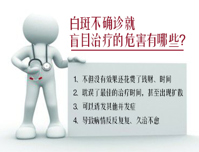 临床上千遍一律的治疗方式,常常会引发各种问题。如白癜风病人治疗白癜风不确诊、不分型、不找诱因盲目进行治疗,只知道自己患上了白癜风病见药就用,导致很多病人长期用药而不能治好,有的病人出现了无效、抗药性、大面积的扩展、药物过敏等等不良反应,失去了佳的治疗时间。还有很多病人患病后不找医生进行系统的治疗,而是到处乱治甚至找一些庸医、偏方、非正规药品等等,用一种药物无效再换一种药物,连续不断的进行治疗,导致误诊、误治。还有的病人不是点状固定型的白癜风也进行植皮手术,术后出现了大面积的扩展,由于破伤所致的白癜风病人也进行植皮手术,疤痕皮肤也进行手术导致术后面部出现了大量的疤痕。还有的白癜风病人是过敏体质也乱用药,从而导致全身性过敏。所以临床诊疗流程里面,强调治疗方案个性化,实则是为病人的身体健康考虑,减少大量不必要的治疗弯路,减轻病人负担。
